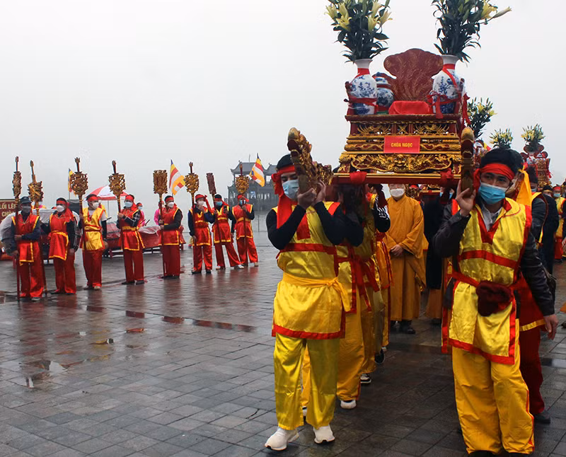 The rituals to open the Tam Chuc Pagoda Festival are reconstructed 1,000 years ago on the pilgrimage route connecting the heritage: Golden Temple - Trang An - Hoa Lu Ancient Capital - Bai Dinh Pagoda - Van Long (Ninh Binh) - Temple Dong Tam (Hoa Binh) - Tam Chuc Pagoda (Ha Nam) - Huong Son Pagoda - Thang Long Imperial Citadel (Hanoi).