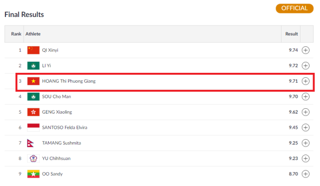 The 1992 born athlete finished just 0.03 points lower than the gold medalist, China’s Qi Xinyi (9.74 points). The silver medal went to Li Yi from Macau (China) with 9.72 points, just 0.01 points higher than Phuong Giang.