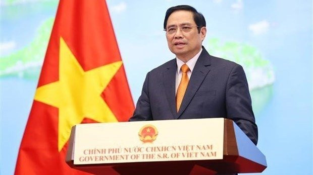 Prime Minister Pham Minh Chinh delivers a speech at the 2021 Global Trade in Services Summit via video (Photo: VNA)