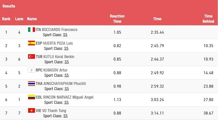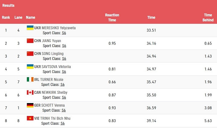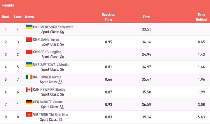 Specifically, Bich Nhu finished last in the women’s 50m freestyle S6 Heat 2 with a time of 39.14 seconds, 5.63 seconds behind heat leader Yelyzaveta Mereshko (Ukraine), who ranked second in the Heats round.