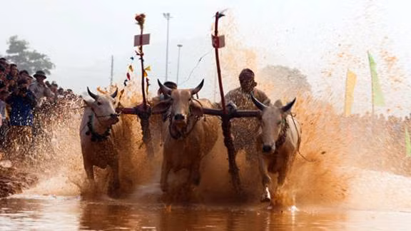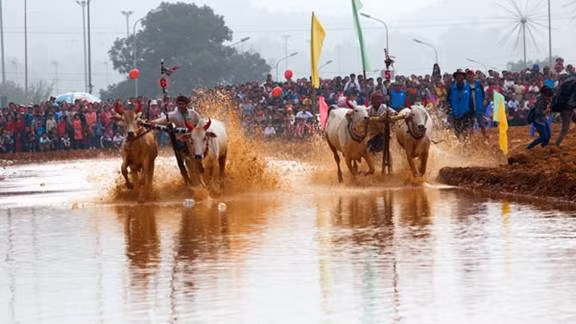 Two pairs of bulls compete on the 120-metre race track