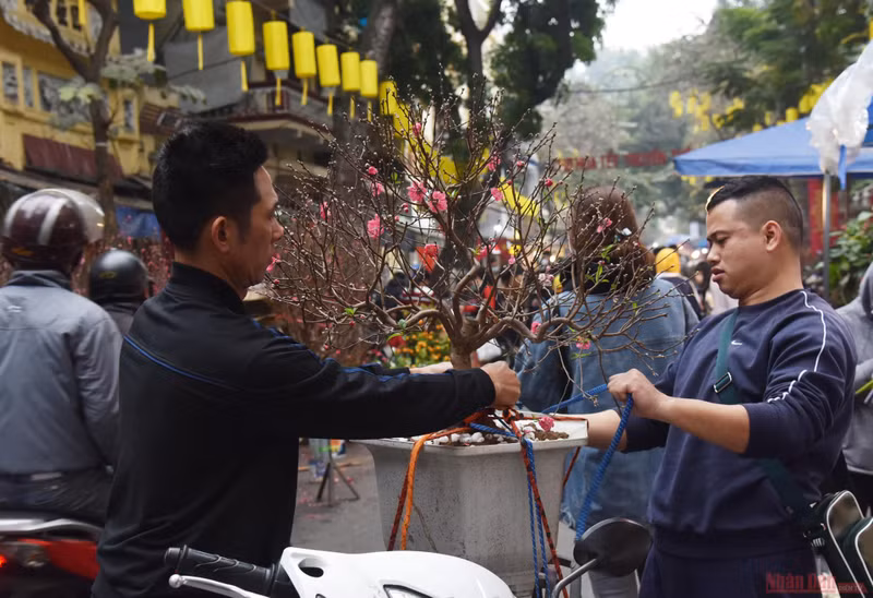 Peach flowers are considered "specialties" in the old market, transported from flower villages of Nhat Tan and Phu Thuong.