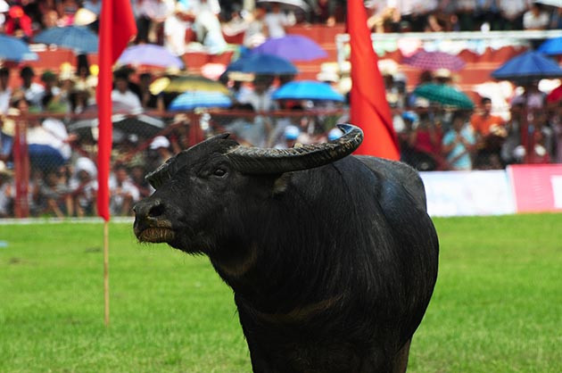 When the two buffalo are about 20 metres from each other, their trainers release them from ropes making it easy for the buffalo to attack each other.