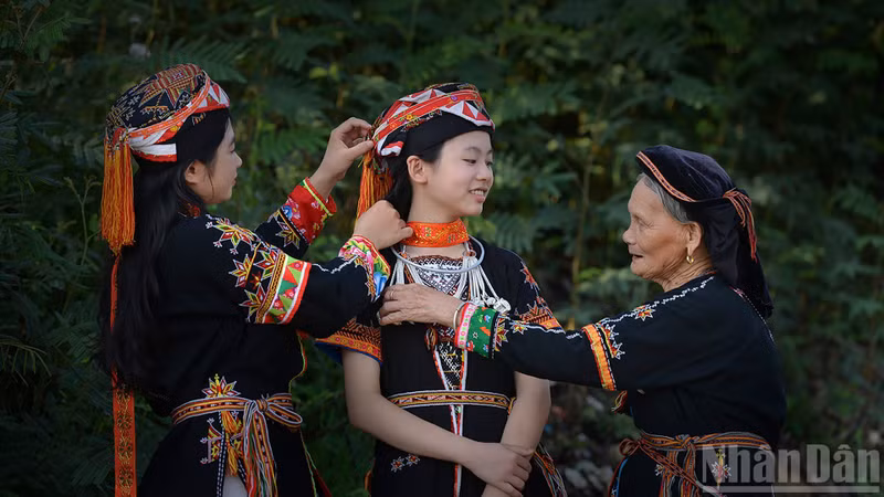 In Phuc An, women still maintain the habit of embroidering by hand and patiently teach their children how to wrap headscarves and tie belts. This practice not only reflects meticulousness in dress but also a deep pride in their ethnic identity. Key features of the white-trousered Dao attire include a black embroidered headscarf, an intricately stitched bodice, and a sash approximately 1.5 metres long and 3–4 centimetres wide. The belt is typically red and yellow, tied snugly around the waist.