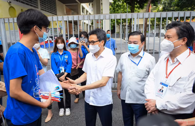 Deputy PM Vu Duc Dam congratulates candidates on completing their first test on the morning of July 7.