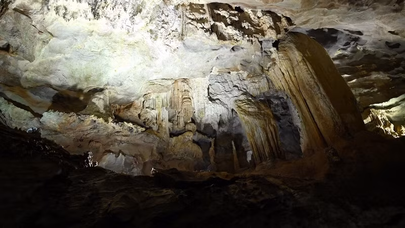 The cave attracts visitors for its gigantic stalactites and mysterious structure.