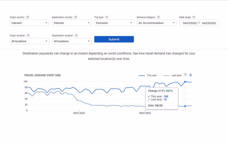 The number of domestic visitors matched indicators of a spike in domestic tourism demand. According to the Google Trends tool, the number of searches for domestic airlines and accommodation in June 2022 exploded, steadily increasing to more than 500% over the same period last year. The search peak on June 20 saw an increase of 567%.