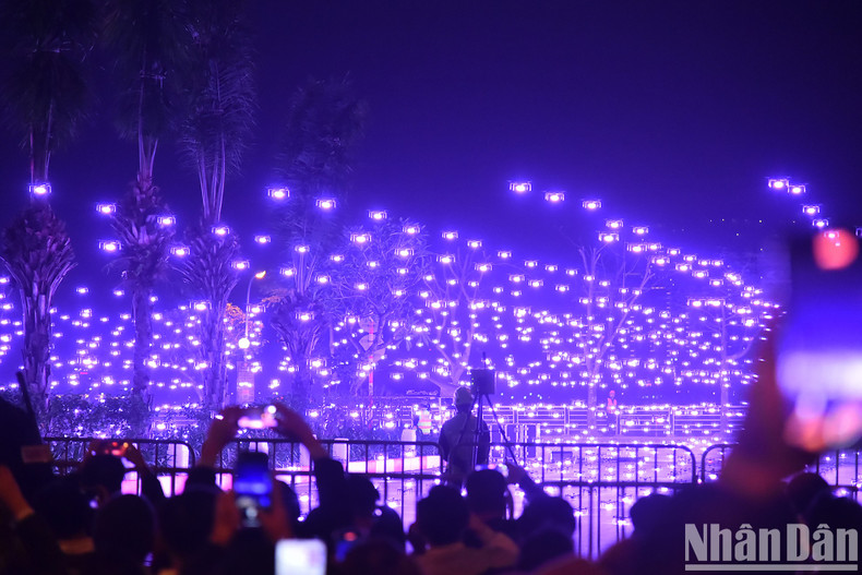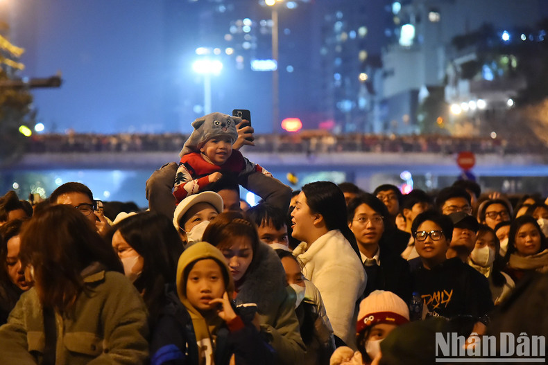 A large crowd gathers at Van Cao T-junction in Tay Ho District to admire the special performance held for the first time on New Year’s Eve.