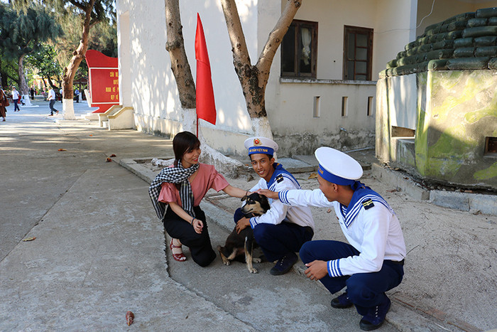 Writer Bui Tieu Quyen talks with soldiers on Son Ca island.