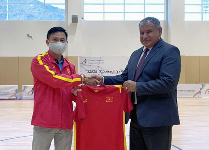 Head of the Vietnamese futsal delegation Tran Anh Tu (L) presents a souvenir shirt to the head of the Iraqi delegation. (Photo: VFF)