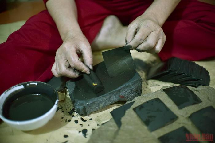 Chinese ink is spread on seed leaves. Cooking glue to make ink from buffalo skin also requires great effort.