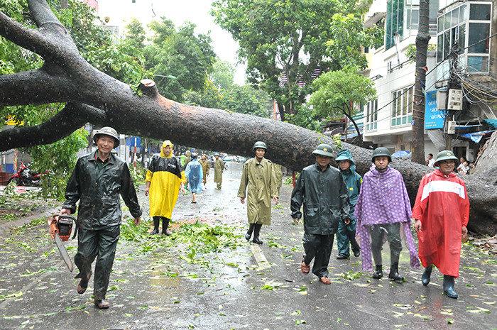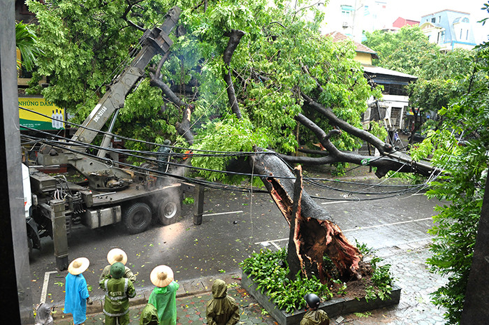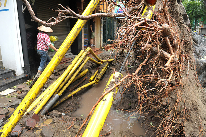 An old living tree is uprooted by the storm, destroying the underground cable system and water pipeline in Ngo Thi Nham ward, Hai Ba Trung district.