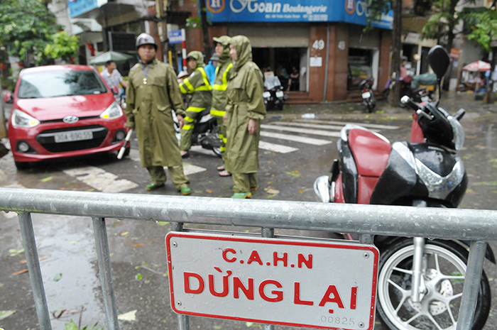 Vice Chairman of the Hanoi People’s Committee Nguyen The Hung (second from left) arrives at the scene to instruct forces on clean up.