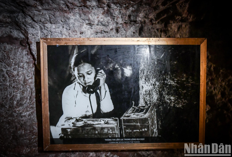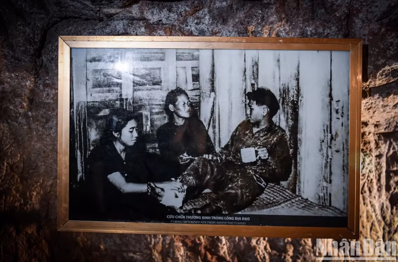| In addition, in the tunnel, there is also a hall with a capacity of 50-60 people and some works such as a water well, rice warehouse, Hoang Cam kitchen, guard station, telephone station, operating room, maternity house, and a hall used as a place for meetings, performing arts, and screening movies. Currently, the old hall area has been used to display photos of the life and fighting process of Vinh Moc people in the deep tunnel. |