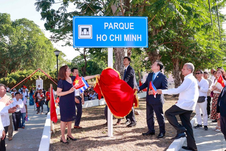 | NA Chairman Vuong Dinh Hue and officials beside the nameplate of Ho Chi Minh Park in Havana. (Photo: VNA) |