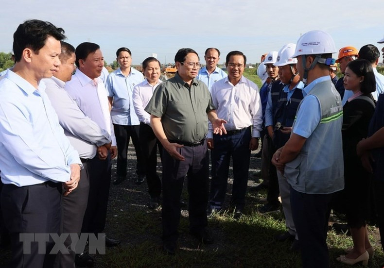 |   PM Pham Minh Chinh interacts with engineers and workers at the construction site.  |