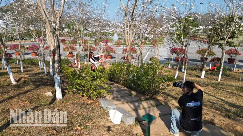 | Not only tourists from outside Son La but also young Thai women eagerly anticipate the blooming season to dress in their traditional attire, pose for photos, and preserve cherished moments amidst the blossoms. |