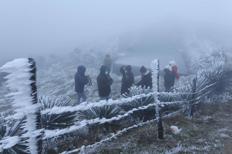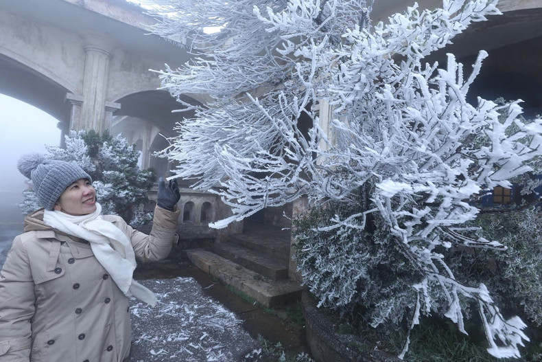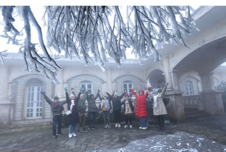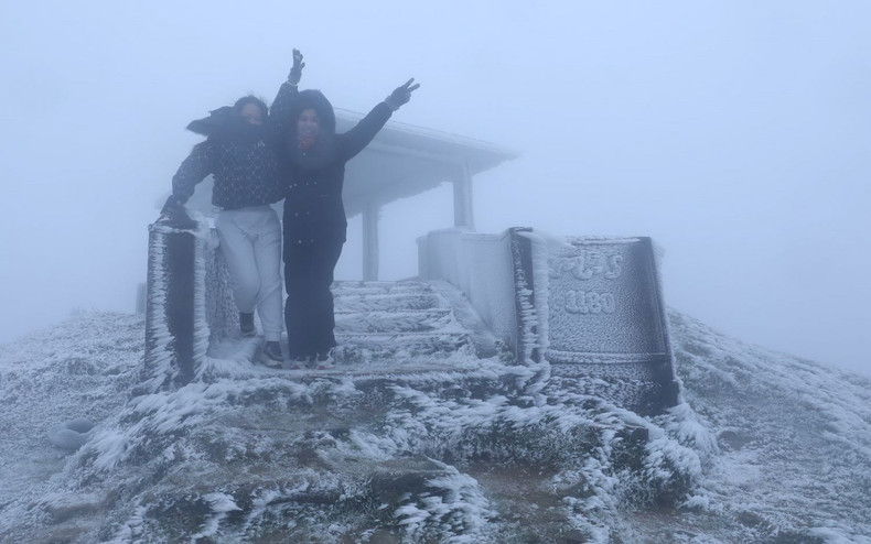 | Visitors are excited at the icy sight at the top of Mau Son Mountain. |