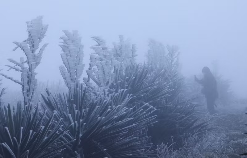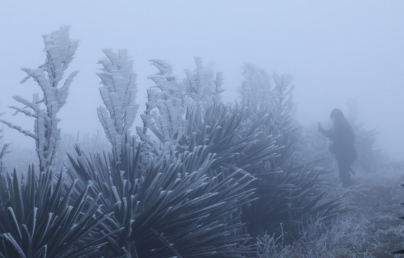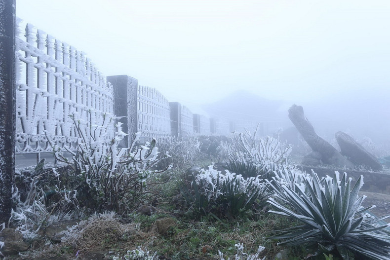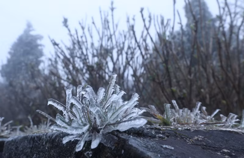Frost clinging to plants on the peak of Mau Son Mountain.