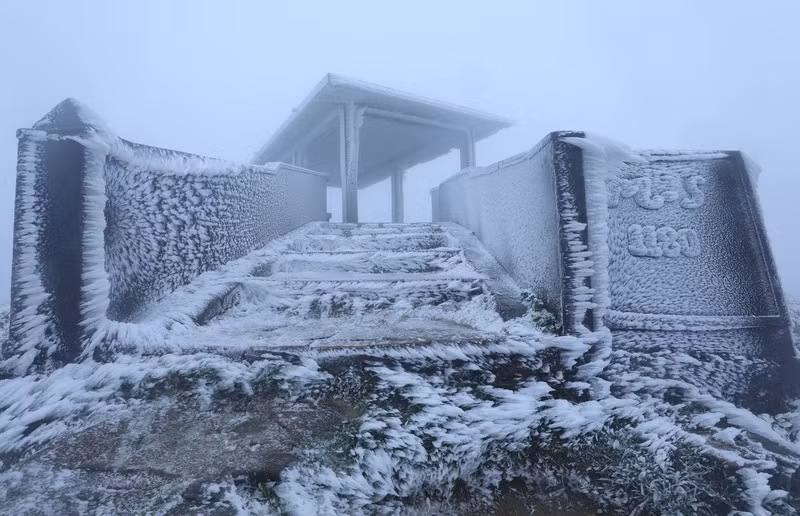 The highest shelter on the peak of Mau Son Mountain is covered with ice.