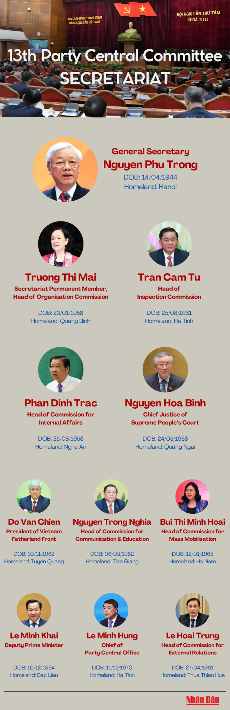 At the 8th plenum of the 13th Party Central Committee, Head of the Commission for External Relations Le Hoai Trung was elected to the Secretariat. The Secretariat now includes 11 members, some elected by the Central Committee and some appointed by the Politburo.