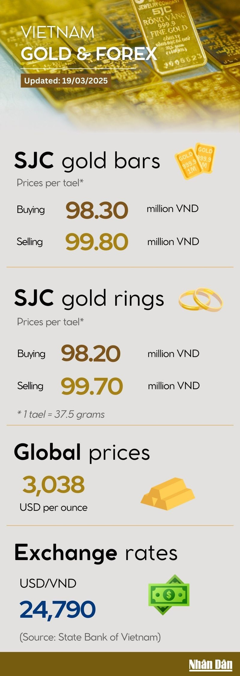 Domestic gold prices increased further to fresh highs on March 19 as gold bar price edged up to 99.8 million VND per tael while gold ring price reached 99.7 million VND per tael.