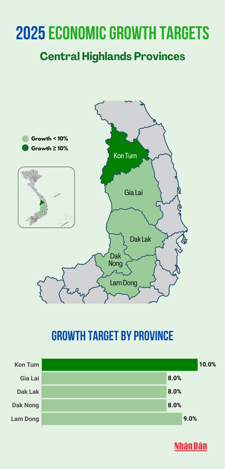 According to Resolution 25 issued by the government on February 5, 2025, the provinces in the Central Highlands aim for an economic growth rate of 8% to 10% in 2025.
