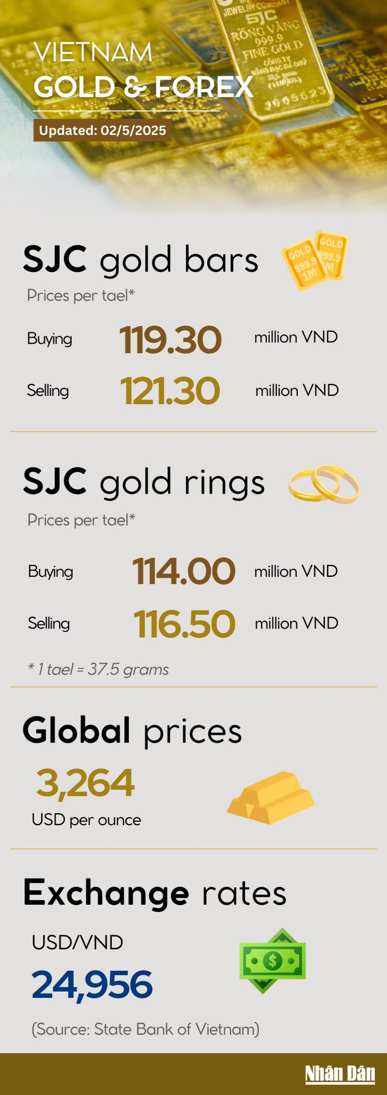 Global gold prices continued to fall sharply on May 2, trading at 3,264 USD per ounce as investors continued to take profits. Domestically, SJC gold bars were traded at 121.3 million VND per tael, while SJC gold rings were traded at 116.5 million VND per tael.
