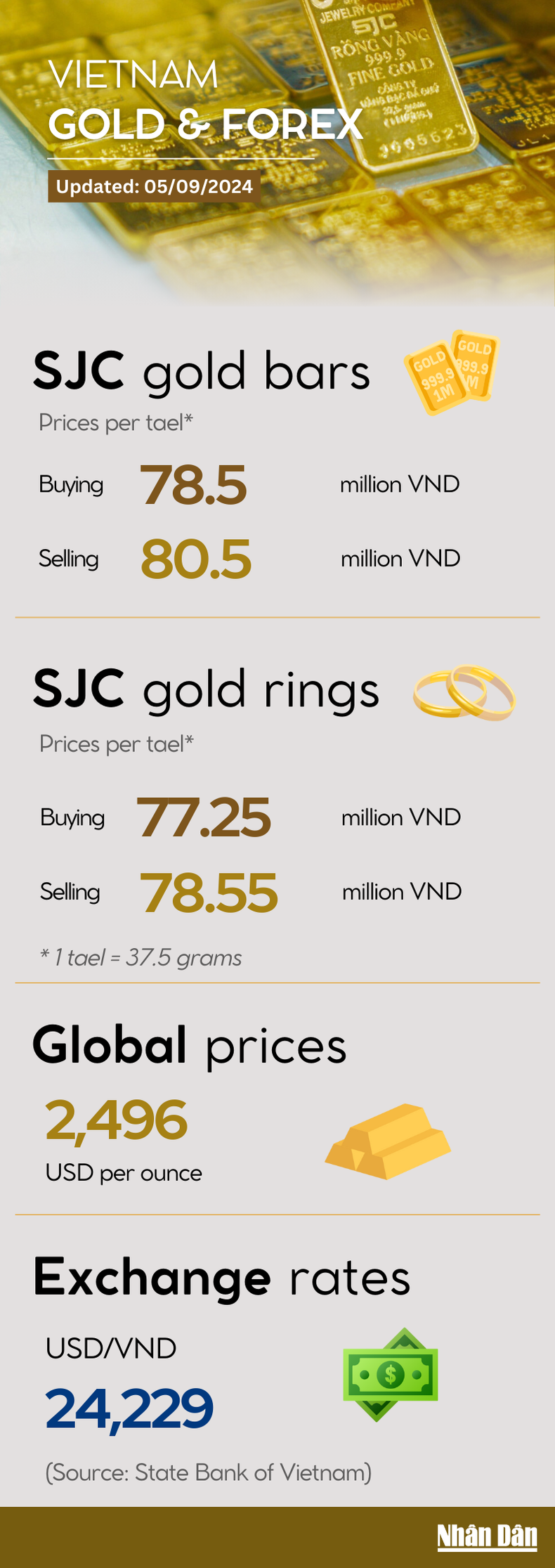 On September 5, world gold prices increased slightly to 2,496 USD/ounce. Domestically, SJC gold bars suddenly dropped by 500,000 VND to 80.5 million VND/tael, while SJC gold rings traded at a high of 78.55 million VND/tael.