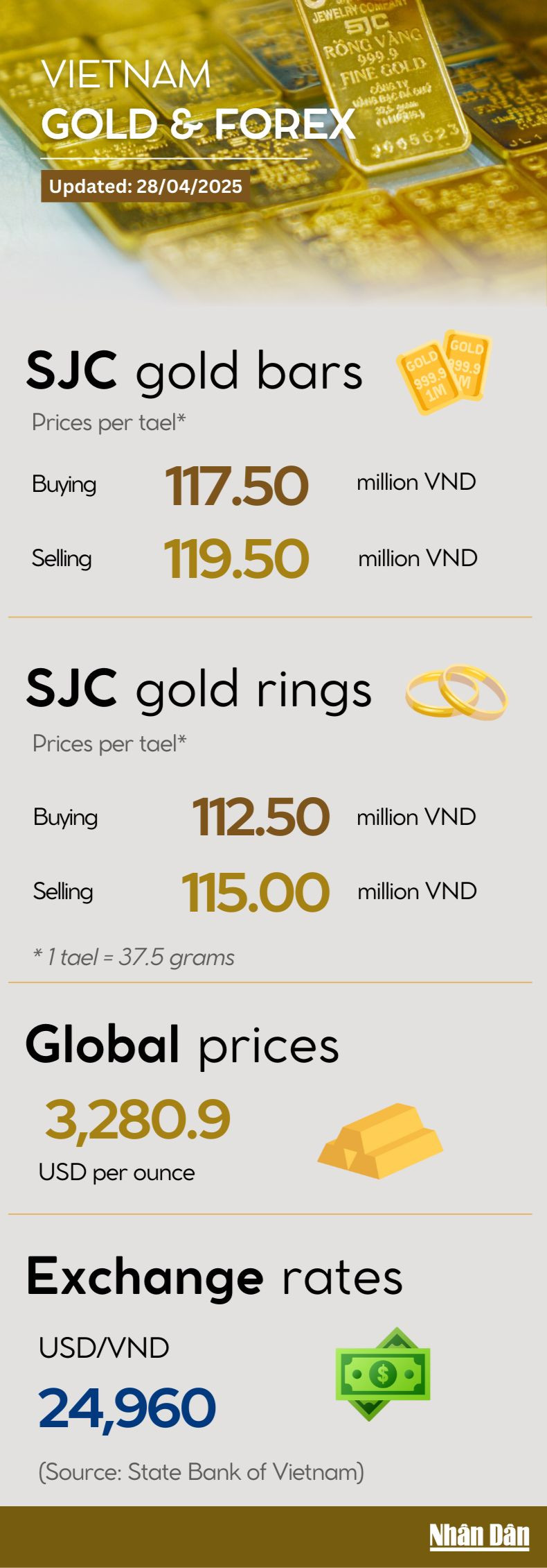 On April 28, global gold prices fell below the mark of 3,000 USD per ounce as the US dollar strengthened and investors took profits. Domestically, SJC gold bars dropped by 1.5 million VND to 119.5 million VND per tael, while SJC gold rings were trading at around 115 million VND per tael.