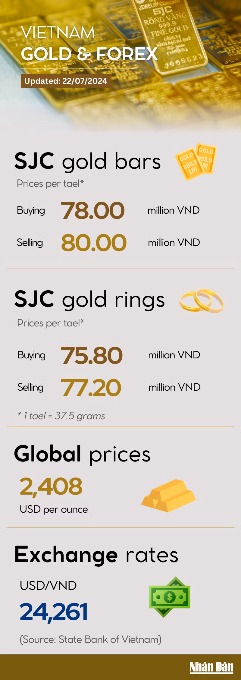 The selling price of SJC-branded gold bars remained unchanged at 80 million VND per tael on July 22, while the selling price for SJC gold rings rose to 77.2 million VND per tael.