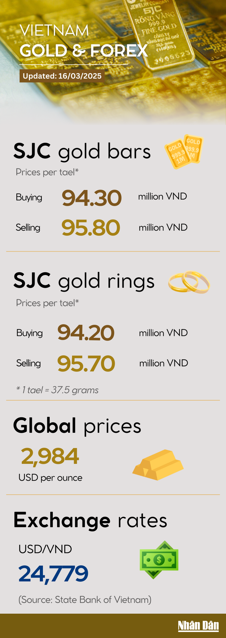 The world gold price on March 16 was trading at 2,984 USD/ounce. This week, gold prices have continuously conquered new records in the context of increasing demand for safe havens from investors. Domestically, at the end of the trading week, SJC gold bars were trading at 95.8 million VND/tael; gold rings followed closely behind gold bars, trading at 95.7 million VND/tael; in particular, DOJI gold rings were sold at 96.3 million VND/tael.