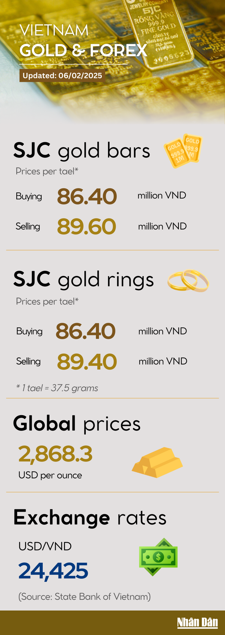 The prices of SJC-branded gold bars dropped to 86.4 million VND per tael for buying and 89.6 million VND per tael for selling on February 6, a day ahead of the God of Wealth Day.
