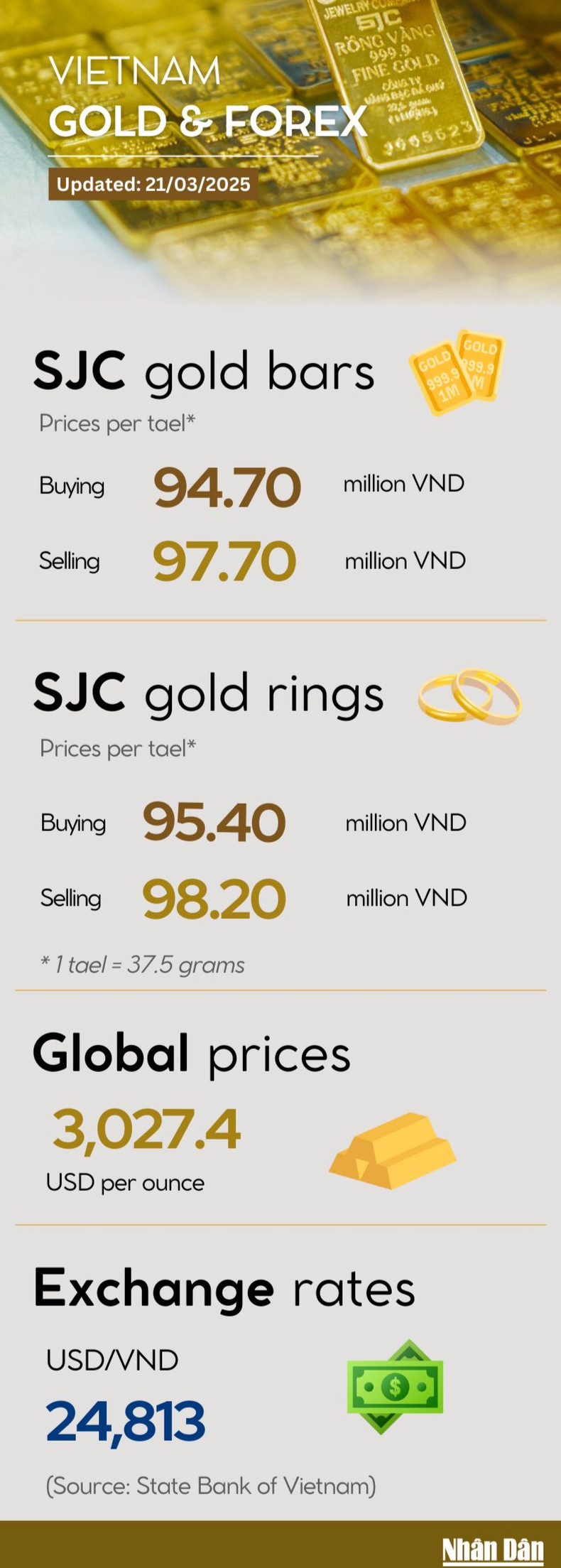 Global gold prices turned downward on March 21 after several consecutive days of surging, trading at 3,027 USD per ounce as investors rushed to take profits. Domestically, gold prices plummeted following world prices. SJC gold bars fell by 2.1 million VND per tael to 97.7 million VND per tael.