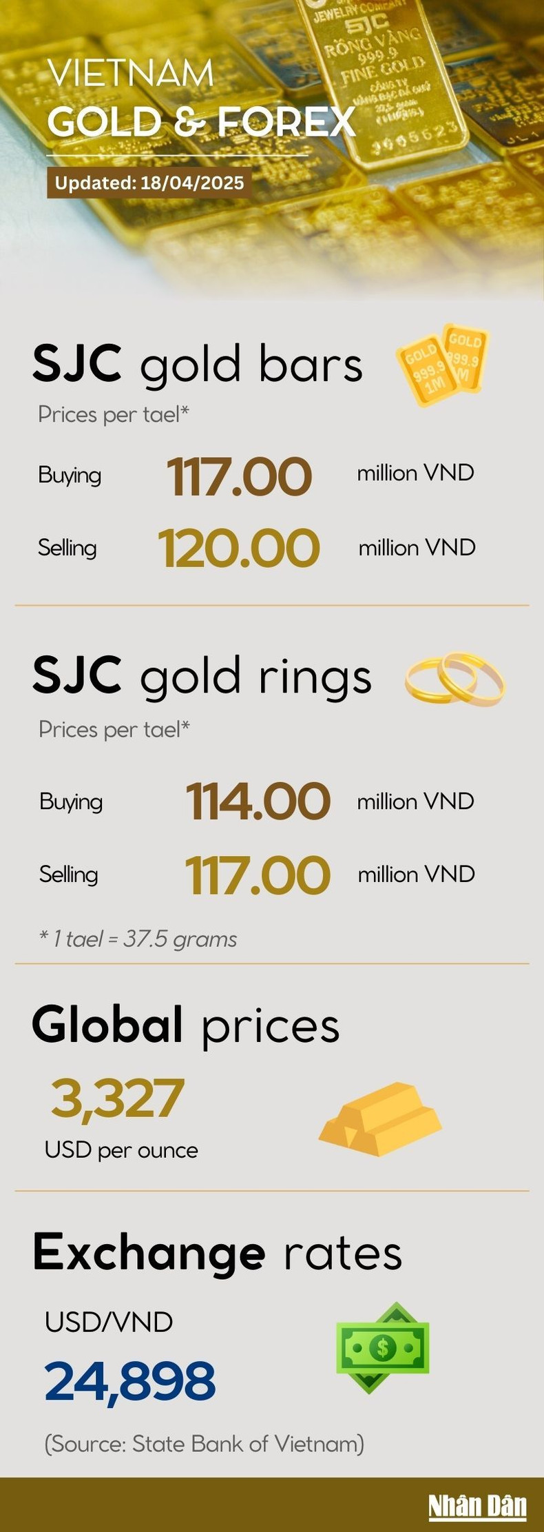 Saigon Jewelry Company-branded gold bar price soared to an all-time high of 120 million VND per tael on April 18, while gold ring price was traded at 117 million VND per tael.