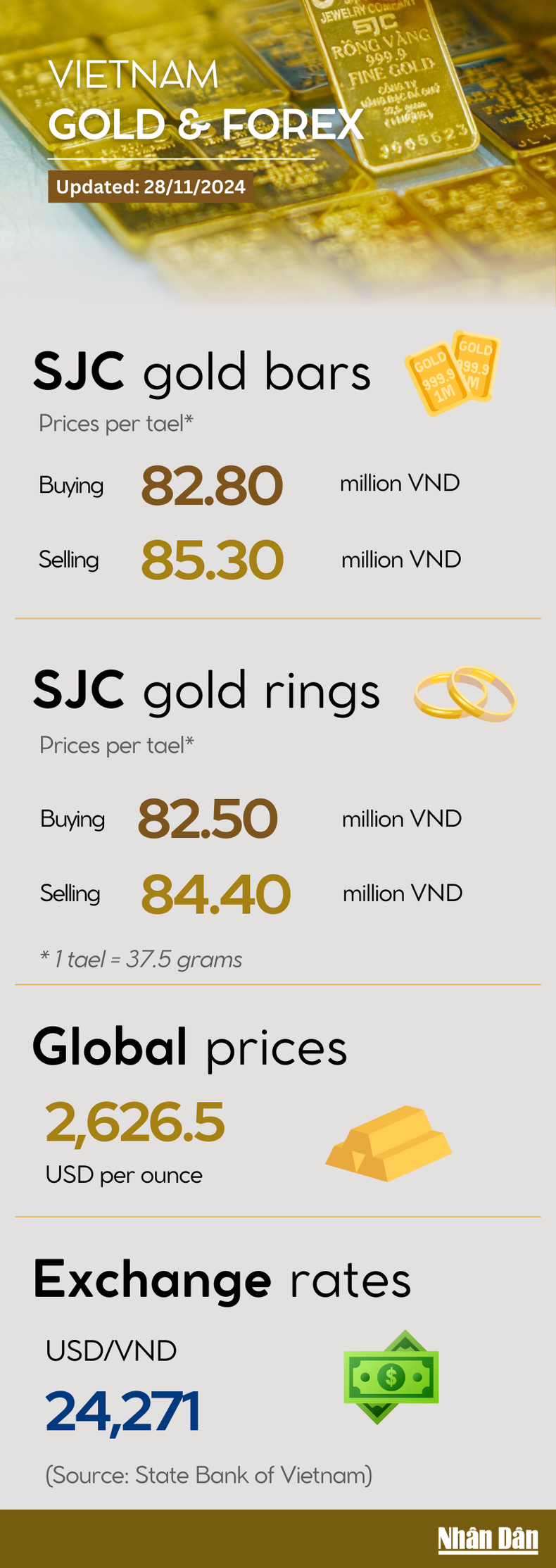 World gold price on November 28 increased slightly by 6.5 USD/ounce due to the weakening USD creating a driving force for gold in the mid-week trading session, listed at 2,625.5 USD/ounce. Domestically, SJC gold bars and gold rings turned to decrease slightly by 200,000-400,000 VND per tael.