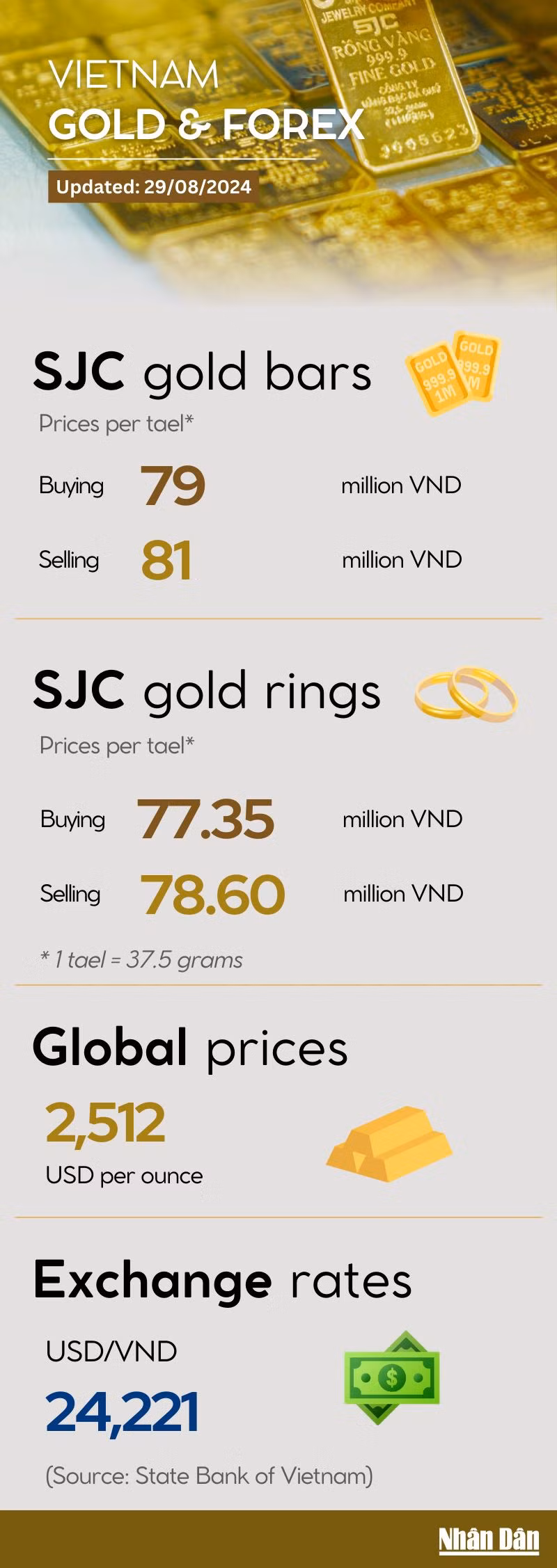 The price of SJC-branded gold bars was traded at 81 million VND per tael while SJC-branded gold rings declined slightly to 78.6 million VND per tael on August 29.