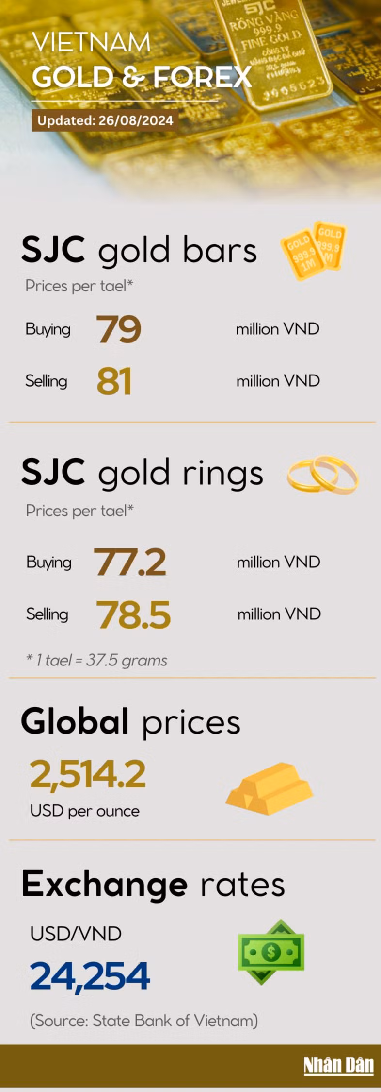 The domestic prices of SJC-branded gold bars stayed unchanged at 81 million VND per tael, while SJC-branded gold ring prices rose to the peak of 78.5 million VND per tael on August 26.