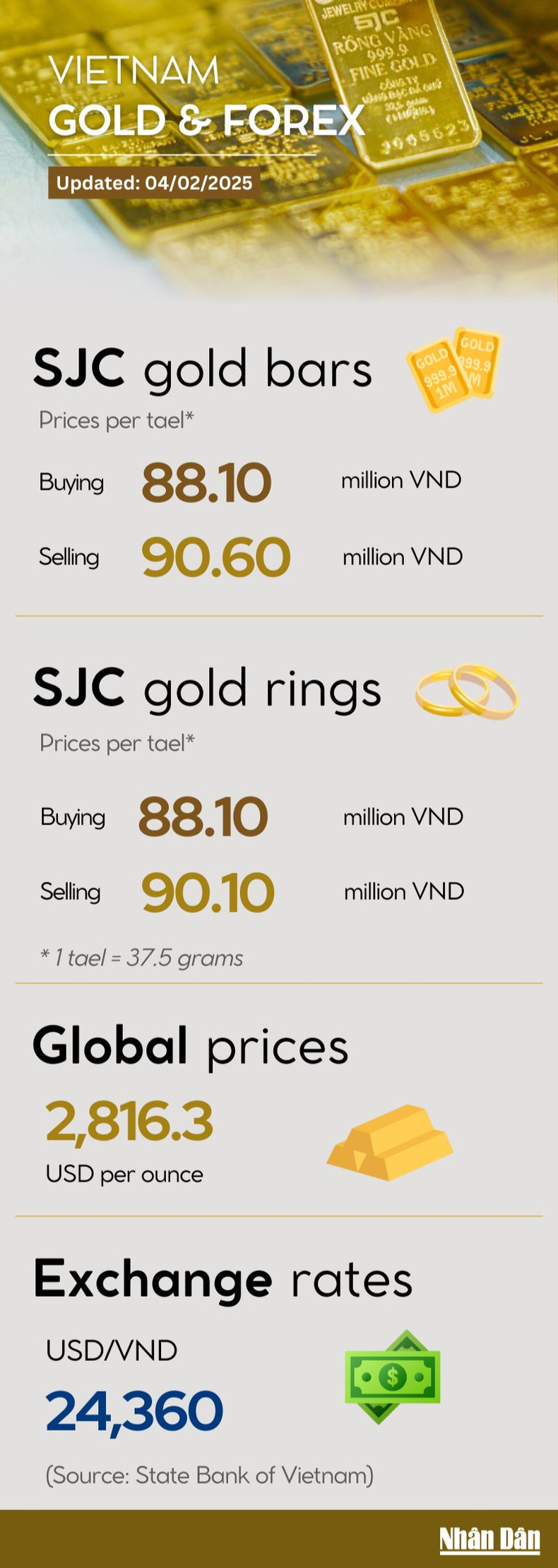 The prices of SJC-branded gold bars and rings rose to 90.6 million VND per tael and 90.1 million VND per tael respectively on February 4.