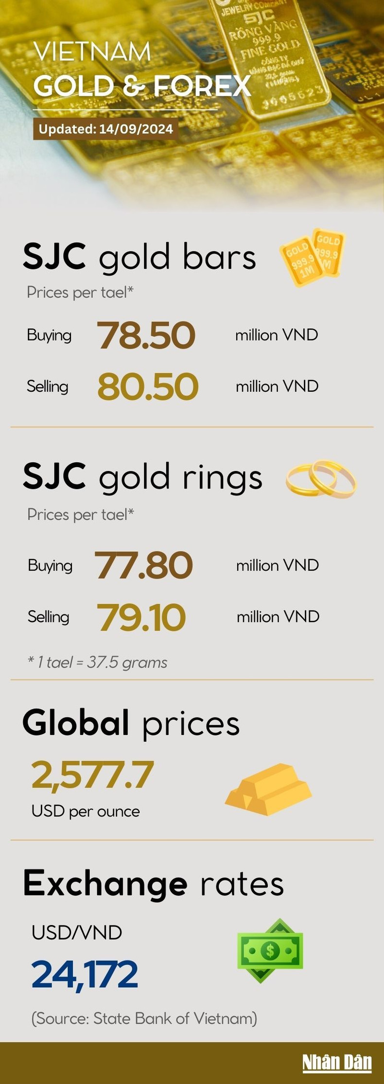 The selling price of SJC-branded gold rings hit new historic peak of 79.1 million VND per tael, while gold bar price was stable at VND80.5 million per tael on September 14.