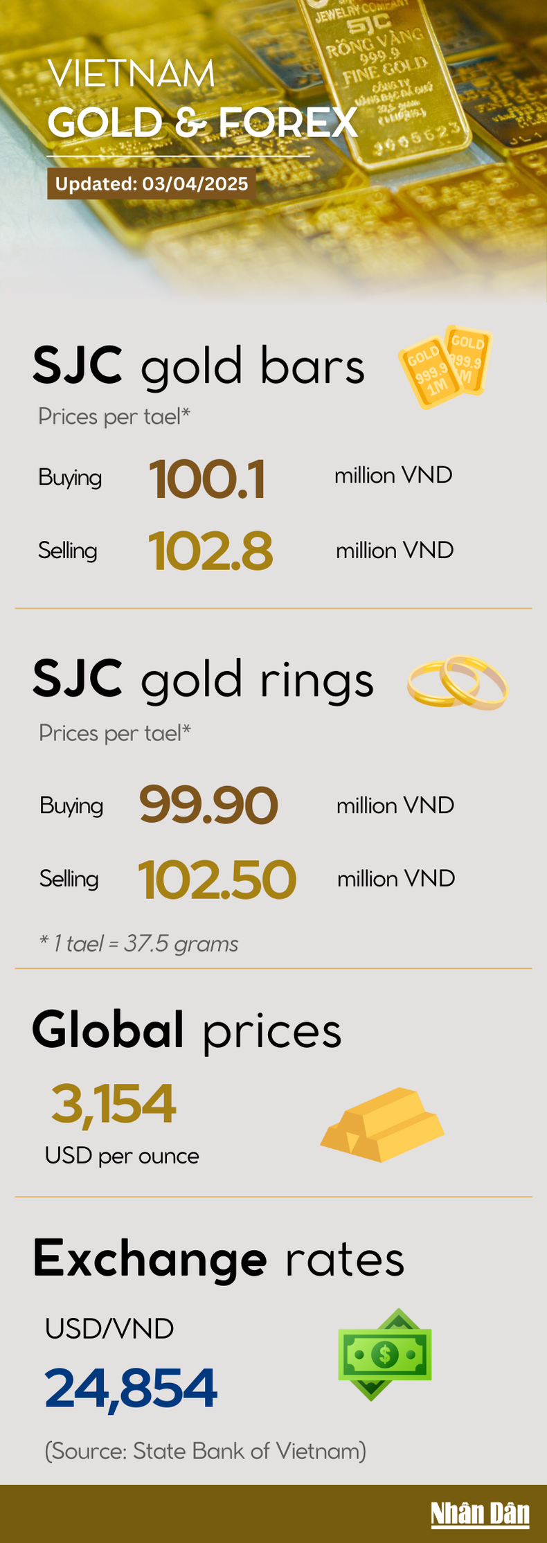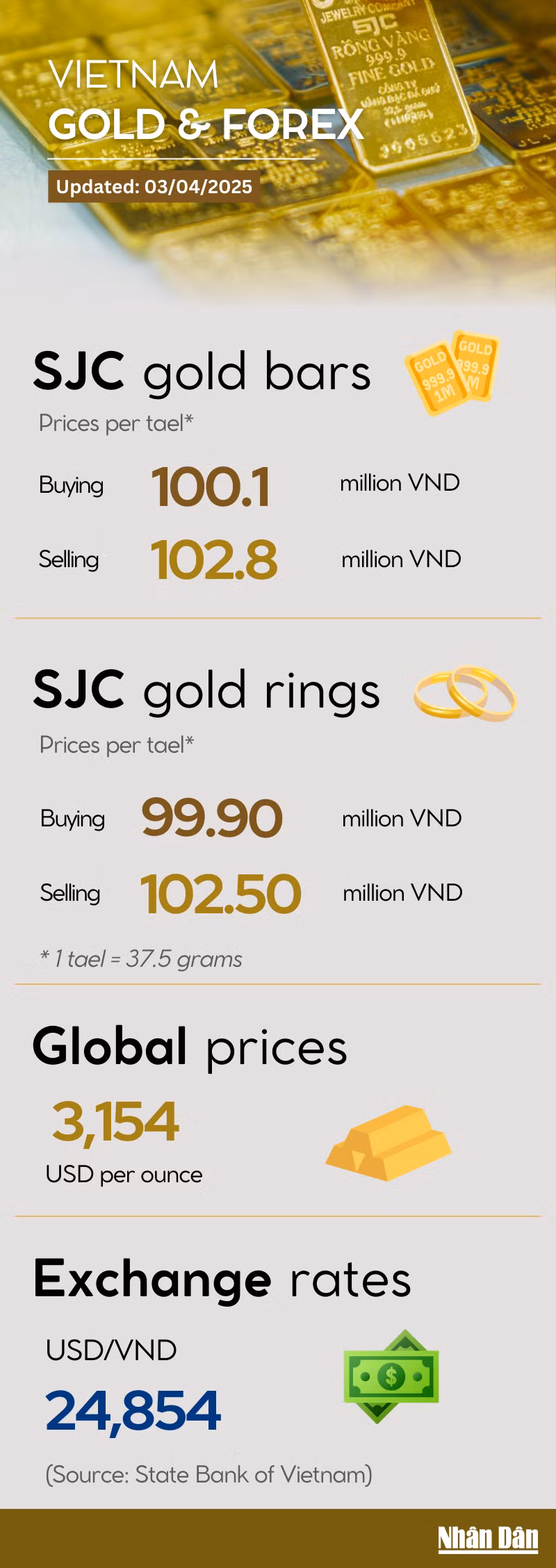 The world gold price on April 3 reversed and increased sharply right after US President Donald Trump announced new tariffs on imported goods, trading at 3,154 USD/ounce. Domestically, the price of SJC gold bars and gold rings increased sharply, trading at 102.8 million VND/tael and 102.5 million VND/tael, respectively; DOJI gold rings were anchored at 102.4 million VND/tael.