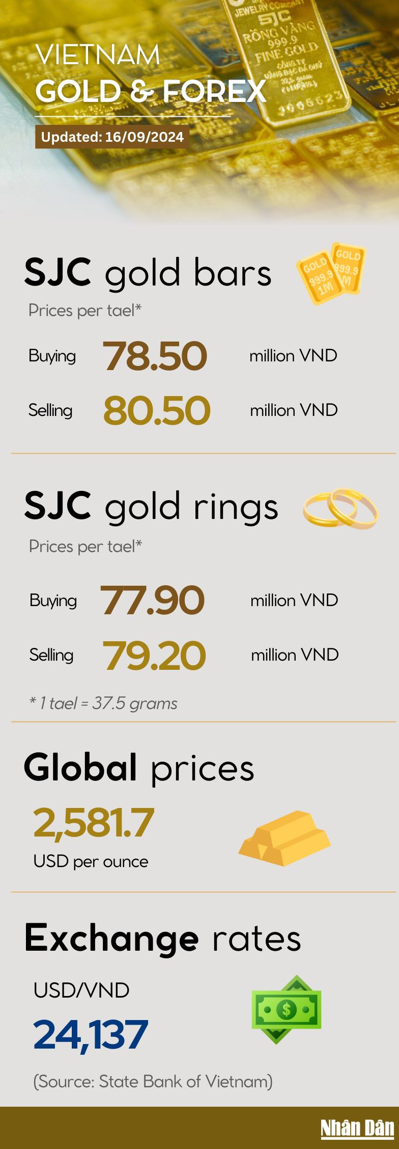 The selling price of SJC-branded gold rings continues to climb to new record of 79.2 million VND per tael, while gold bar price was stable at 80.5 million VND per tael on September 16.