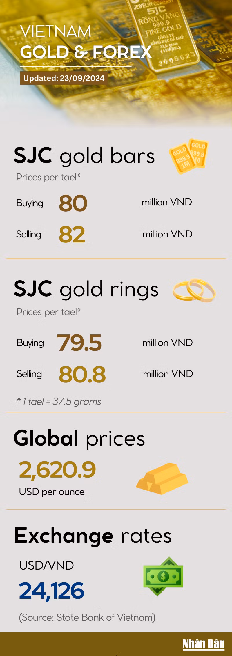 World gold prices on September 23 hovered around the peak, trading at 2,620 USD/ounce, as experts forecast interest rates to continue to fall in 2024. Domestically, SJC gold bars traded at 82 million VND/tael, with SJC gold rings increasing sharply to a new record of 80.8 million VND/tael.