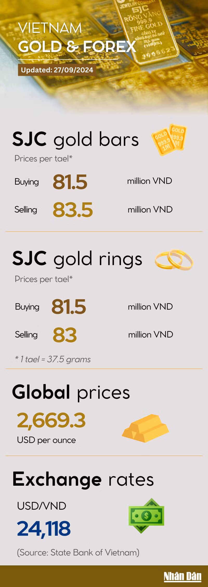 The world gold price on September 27 has not stopped its continuous increase, trading at 2,669.3 USD/ounce as expectations for the next easing by the US Federal Reserve (FED) are increasing. Domestically, gold rings prices have continuously increased, breaking old records and setting new peaks every day when climbing to 83.35 million VND/tael, while SJC gold bars are trading at 83.5 million VND/tael.