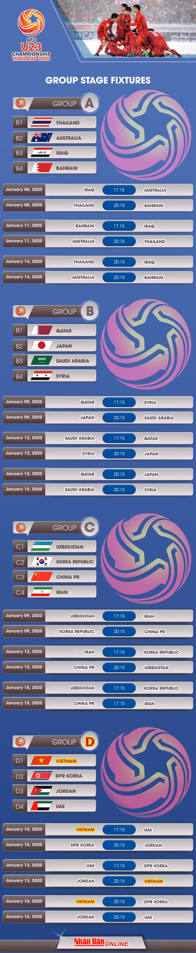 The following Infographic shows the detailed schedule of 24 group-stage fixtures of the 2020 AFC U23 campaign, including Vietnam U23s' three Group D matches against the UAE, Jordan and the DPR Korea.
