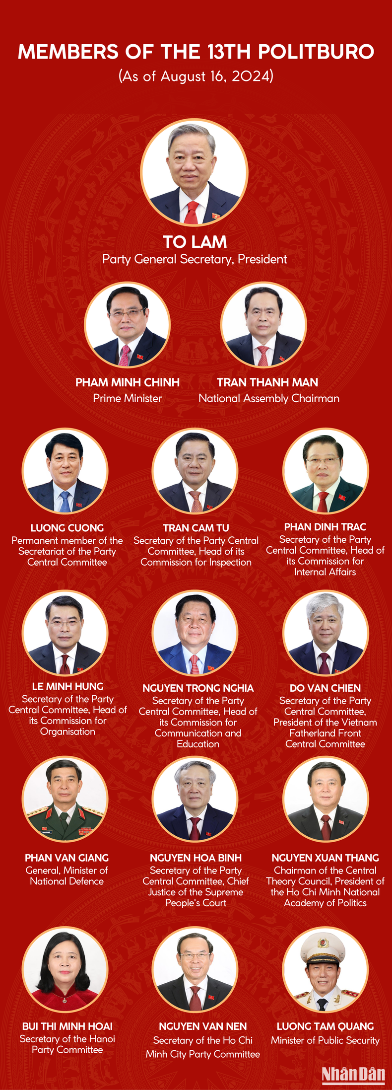 Below is the list of members of the 13th Politburo, as of August 16, 2024.