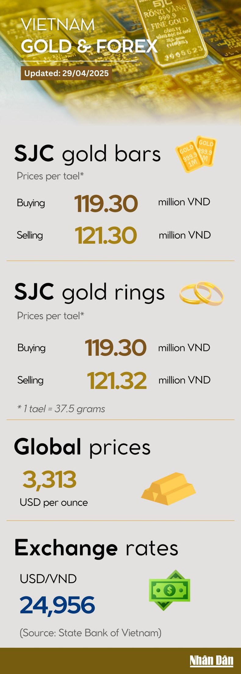 On April 29, global gold prices decreased slightly, trading around 3,313 USD per ounce. Domestically, SJC gold bar prices rose to 121.3 million VND per tael, while SJC ring gold climbed to 121.32 million VND per tael.