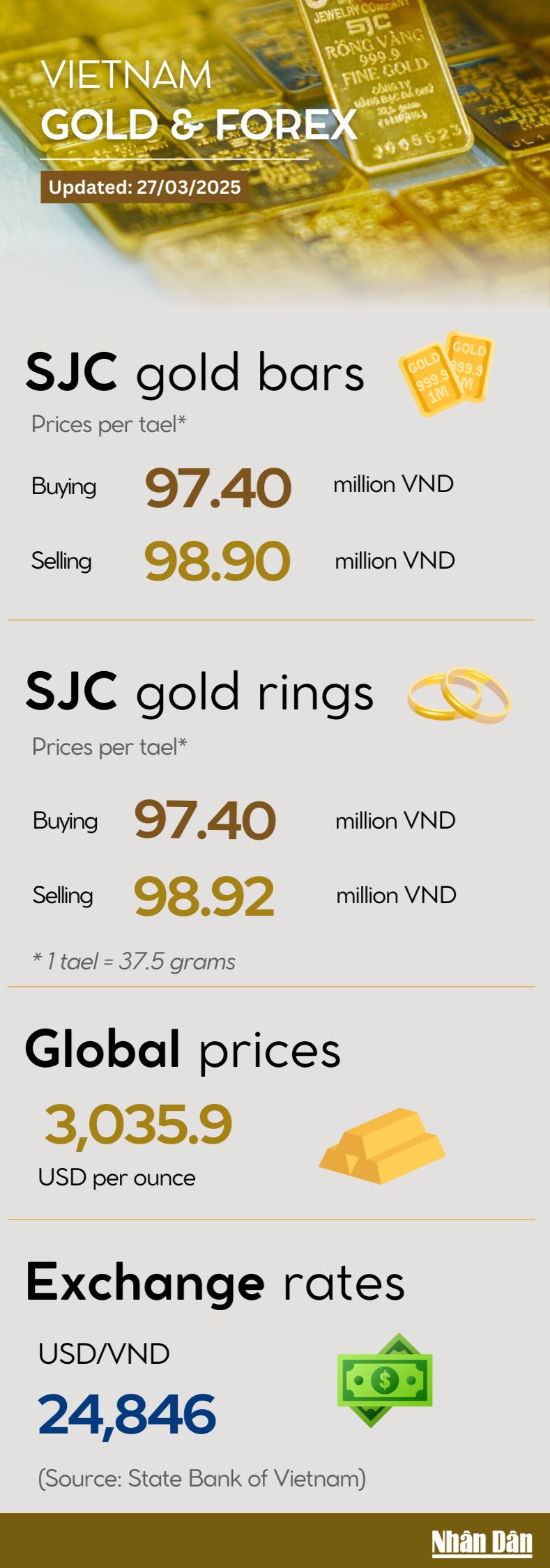 On March 27, global gold prices continued their upward trend, trading at 3,035.9 USD per ounce. In the domestic market, SJC gold bars and gold rings were traded at 98.9 million VND per tael and 98.92 million VND per tael, respectively.