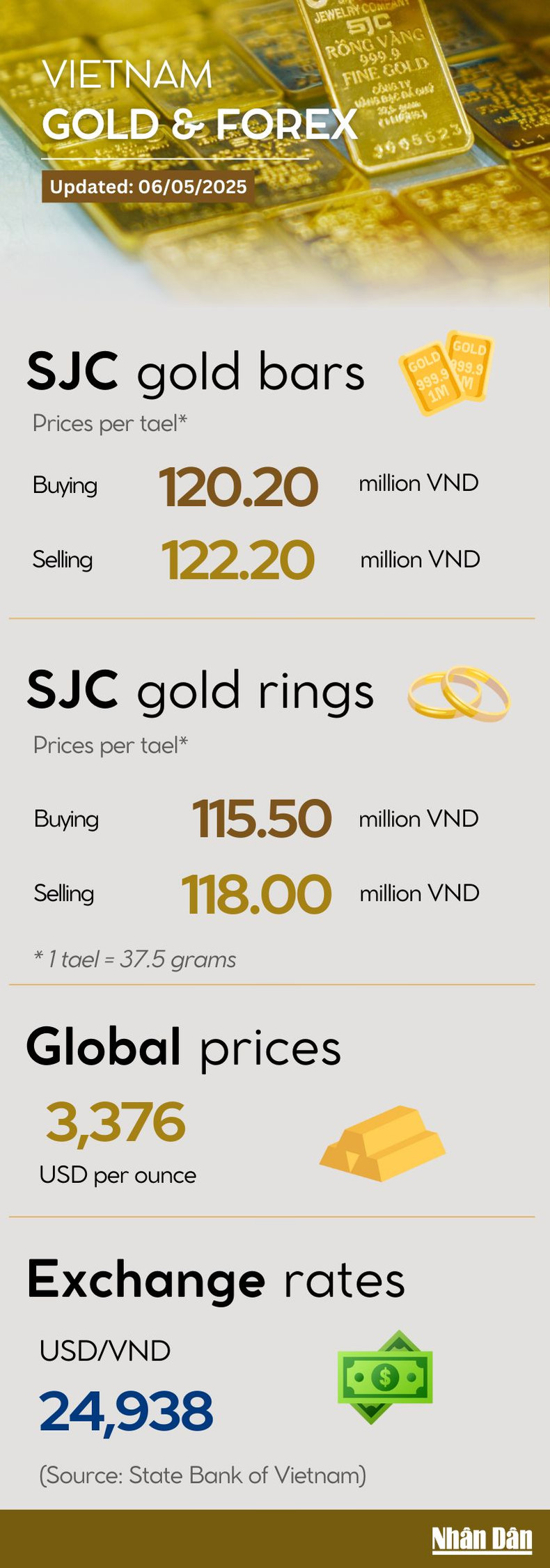 Global gold prices soared on May 6, driven by increasing demand and a weakening US dollar, with trading reaching 3,376 USD per ounce. Domestically, SJC gold bullion recorded a dramatic rise of over 2 million VND per tael, trading at 122.2 million VND per tael. Meanwhile, gold rings jumped by 3 million VND per tael to reach 118 million VND per tael.