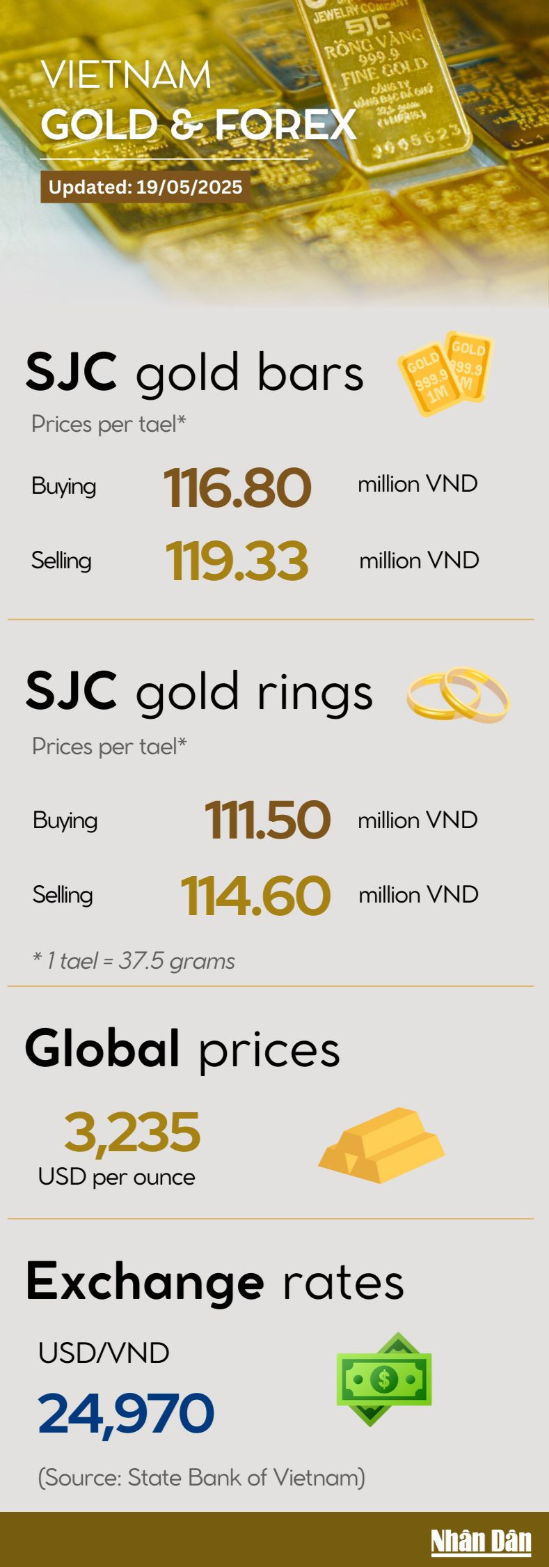 On May 19, global gold price rose to 3,235 USD per ounce after several consecutive days of decline. Domestically, the SJC gold bar price increased to 119.33 million VND per tael, while the SJC ring gold price dropped to 114.6 million VND per tael.